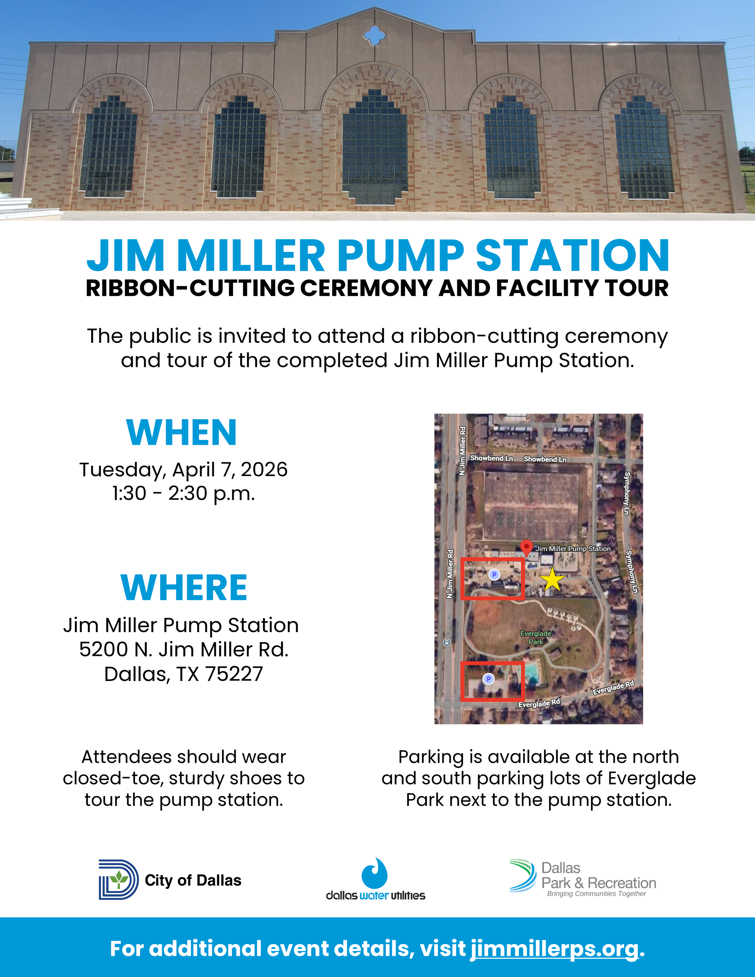 April 2, 2026 - The public is invited to join Dallas Water Utilities (DWU) for a ribbon-cutting ceremony to celebrate the completion of upgrades to the Jim Miller Pump Station. The ceremony will be held on Tuesday, April 7 from 1:30-2:30 p.m. at 5200 N. Jim Miller Road, Dallas, TX 75227. Attendees are advised to wear closed-toe, sturdy shoes to tour the facility after the ribbon-cutting ceremony.